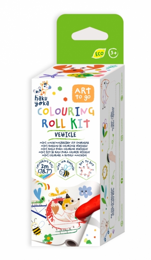 - Mini zestaw do kolorowania zawiera kolorowankę w rolce o rozmiarze 2m, 4 kredki w kształcie fasolek oraz 20 naklejek.
