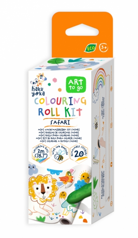 - Mini zestaw do kolorowania zawiera kolorowankę w rolce o rozmiarze 2m, 4 kredki w kształcie fasolek oraz 20 naklejek.