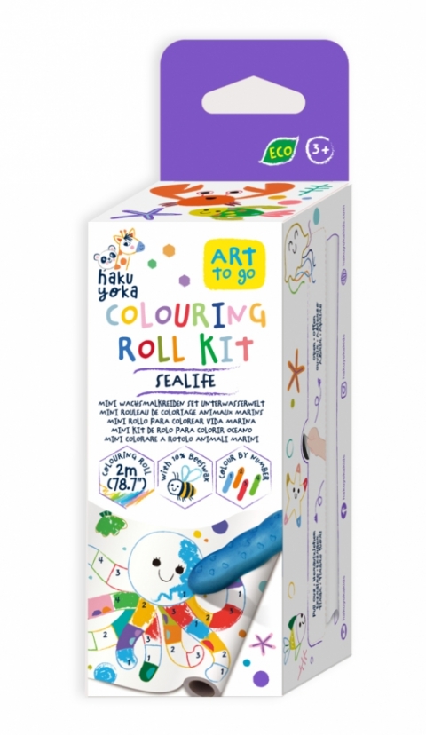 - Mini zestaw do kolorowania zawiera kolorowankę w rolce o rozmiarze 2m, 4 kredki w kształcie fasolek oraz 20 naklejek.