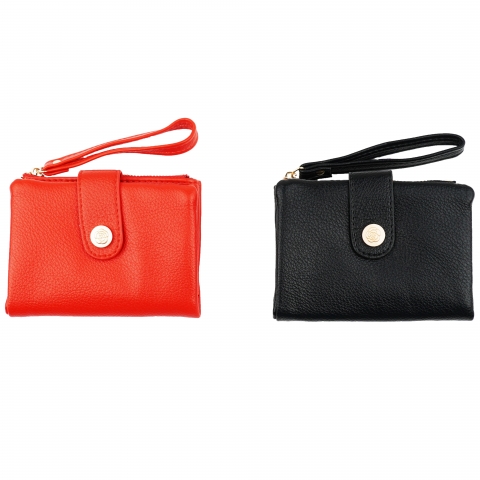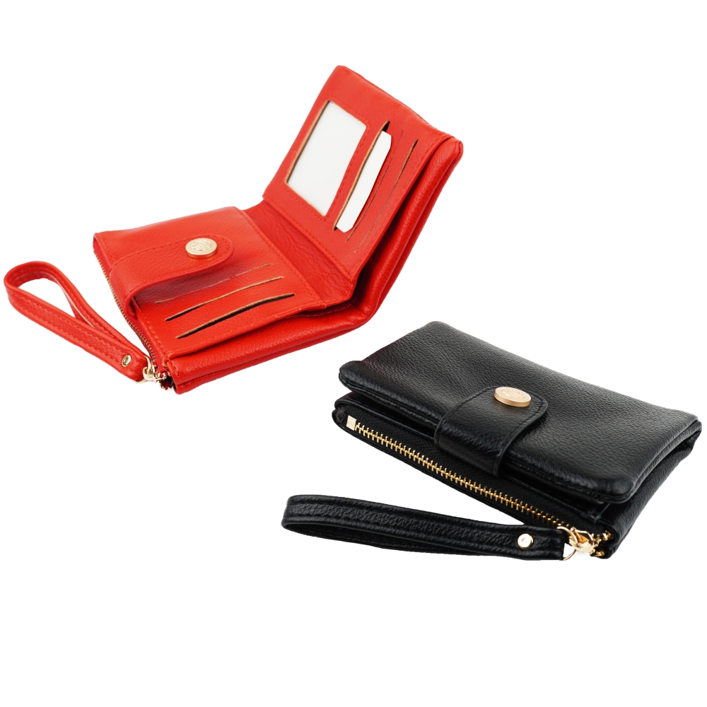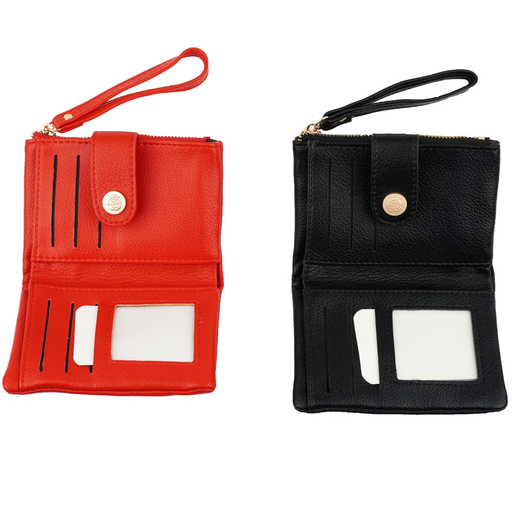 Miniaturowy damski portfel - posiada kilka przegródek na karty i dokumenty, przeźroczyste miejsce na zdjęcie i osobną kieszonkę na drobne. Wykonany z materiału przypominającego wizualnie skórę. Pasek pozwala na dodatkowe zabezpieczenie go w torebce.