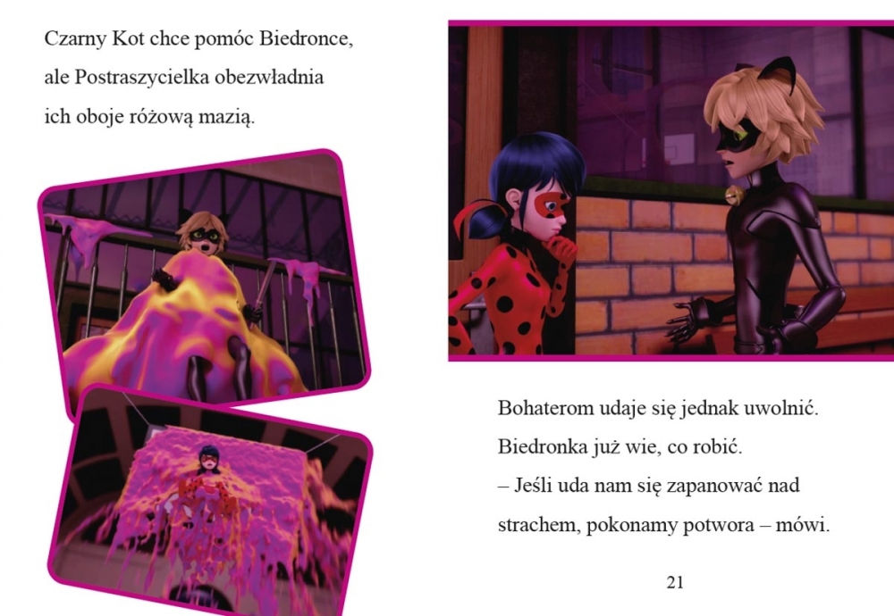 Mylene gra główną rolę w strasznym horrorze. Ale potwór, któremu ma stawić czoła w filmie, przeraża ją tak bardzo, że nie jest w stanie dobrze zagrać swej postaci. Niegodziwy Władca Ciem postanawia to wykorzystać i zamienia Mylene w Postraszycielkę. Złe alter ego Mylene sieje postrach w szkole, uprowadza uczniów, a budynek pokrywa tajemniczą różową mazią. Biedronka i Czarny Kot muszą schwytać i unieszkodliwić Postraszycielkę, by prawdziwa Mylene wróciła! Trzymająca w napięciu historia, prosty tekst i efektowne ilustracje zapraszają do lektury. Książkę łatwo przeczytać samodzielnie, co daje satysfakcję i rozbudza apetyt na kolejne tytuły!