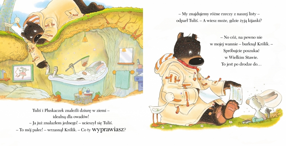 Przezabawne przygody zaczynają się, gdy Pani Łosia rozdaje wszystkim kartki z listą roślin i stworzeń do znalezienia i zaznaczenia. Miś Tuliś, Puszatka, Pluskaczek i ich nowi przyjaciele szukają i znajdują kwiaty, jagody, owady, kijanki, ślimaki...