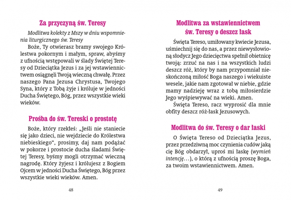 Modlitewnik ten może się stać doskonałym towarzyszem w procesie naszego rozwoju duchowego, a także pomocą w chwilach trudności i zmagań wewnętrznych. Dzięki niemu możemy nie tylko prosić św. Teresę o wstawiennictwo, ale także uczyć się od niej dziecięcej ufności, cierpliwości i oddania woli Bożej. Jest to bowiem nie tylko zbiór modlitw, lecz także zaproszenie do głębszego poznania duchowości św. Teresy – drogi świętości dostępnej każdemu, niezależnie od powołania i życiowych okoliczności.