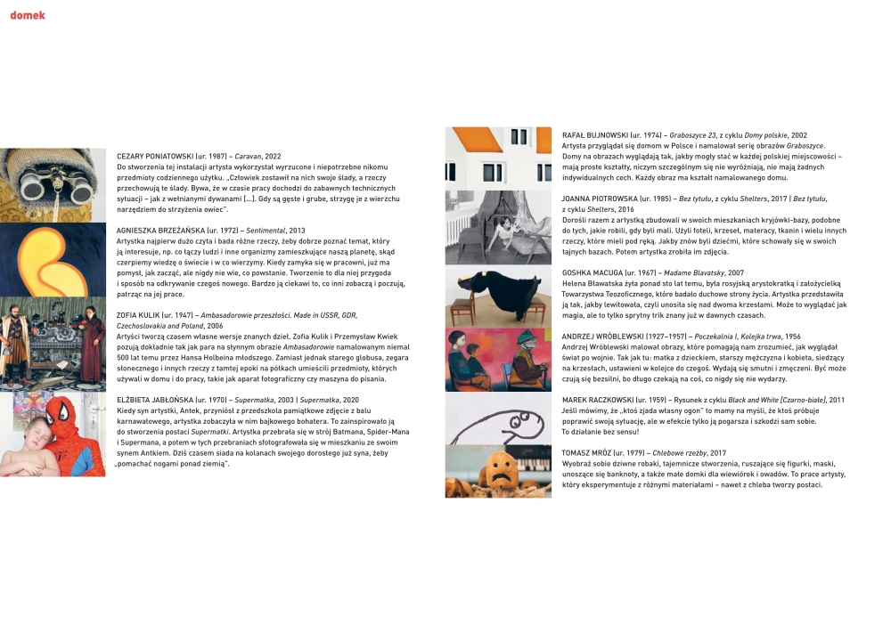 Lista artystek i artystów, których dzieła są w naszej książce: Magdalena Abakanowicz, Paweł Althamer, Karolina Balcer, Cezary Bodzianowski, Pamela Bożek, Olaf Brzeski, Agnieszka Brzeżańska, Rafał Bujnowski, Bogna Burska, Martyna Czech, Wanda Czełkowska, Oskar Dawicki, Marta Deskur, Monika Drożyńska, Stanisław Dróżdż, Edward Dwurnik, Wojciech Fangor, Stefan Gierowski, Zuza Golińska, Maurycy Gomulicki, Aneta Grzeszykowska, Karolina Grzywnowicz, Izabella Gustowska, Weronika Gęsicka, Władysław Hasior, Elżbieta Jabłońska, Karolina Jabłońska, Zuzanna Janin, Maria Jarema, Ewa Juszkiewicz, Katarzyna Józefowicz, Tadeusz Kantor, Ida Karkoszka, Katarzyna Kobro, Łukasz Korolkiewicz, Daniel Kotowski, Katarzyna Kozyra, Edward Krasiński, Marta Krześlak, Hanna Krzysztofiak, Tomasz Kręcicki, Zofia Kulik, Ewa Kuryluk, Diana Lelonek, Róża Litwa, Natalia LL, Grupa Luxus, Marcin Maciejowski, Goshka Macuga, Cecylia Malik i Siostry Rzeki, Monika Mamzeta, Krzysztof Maniak, Nadia Markiewicz, Honorata Martin i Maksymilian Podleśny, Gizela Mickiewicz, Małgorzata Mirga-Tas, Tomasz Mróz, Teresa Murak, Jerzy Nowosielski, Anna Okrasko, Dominika Olszowy, Roman Opałka, Hanna Orzechowska, Paulina Ołowska, Maria Pinińska-Bereś, Joanna Piotrowska, Cyryl Polaczek, Agnieszka Polska, Cezary Poniatowski, Ludmiła Popiel, Katarzyna Przezwańska, Marek Raczkowski, Joanna Rajkowska, Zbigniew Rogalski i Tymon Rogalski, Erna Rosenstein, Jerzy Rosołowicz, Daniel Rycharski, Zofia Rydet, Wilhelm Sasnal, Jadwiga Sawicka, Janek Simon, Konrad Smoleński, Marek Sobczyk, Monika Sosnowska, Magdalena Starska, Roman Stańczak, Irmina Staś, Henryk Stażewski, Władysław Strzemiński, Iza Szostak, Alina Szapocznikow, Iza Tarasewicz, Leon Tarasewicz, Slavs and Tatars, Andrzej Tobis, Teresa Tyszkiewicz, Piotr Uklański, Aleksandra Waliszewska, Zbigniew Warpechowski, Karolina Wiktor, Ryszard Winiarski, Krzysztof Wodiczko, Andrzej Wróblewski, Julita Wójcik, Jaśmina Wójcik, Anna Zaradny, Jerzy „Jurry” Zieliński, Jakub Julian Ziółkowski.