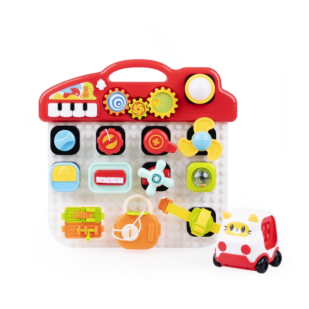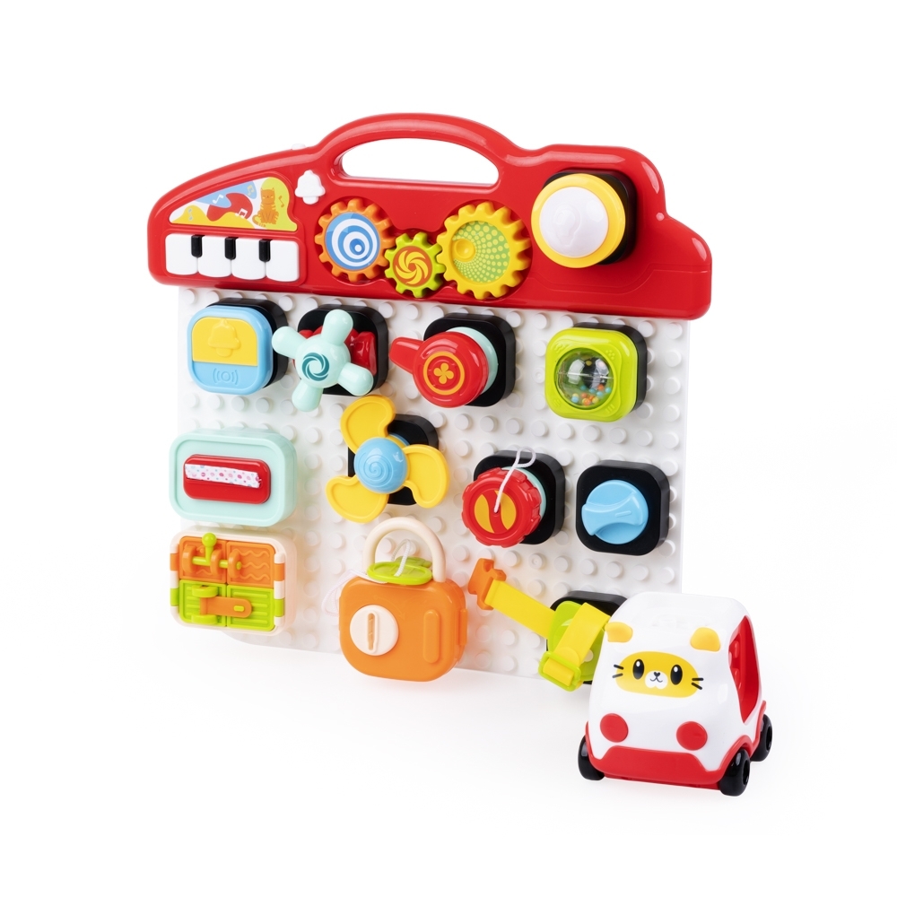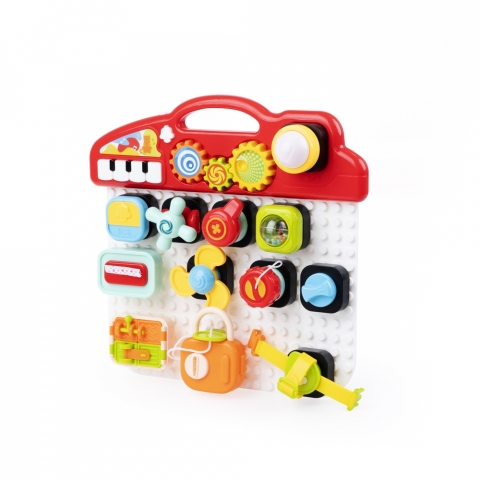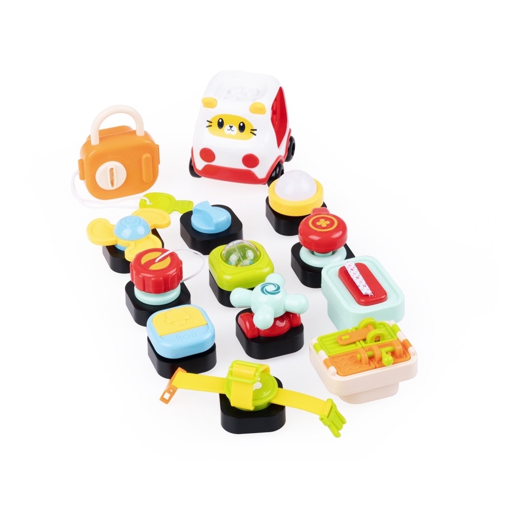 - zestaw składa się ze ścianki z wypustkami do wciskania elementów, klocków z zadaniami motorycznymi, pojazdu ze ściankami umożliwiającymi przypięcie do niego klocków oraz z panelu dźwiękowego z miejscem na aktywny element, pianinkiem, dzwonkiem i zębatkami do przekręcania;