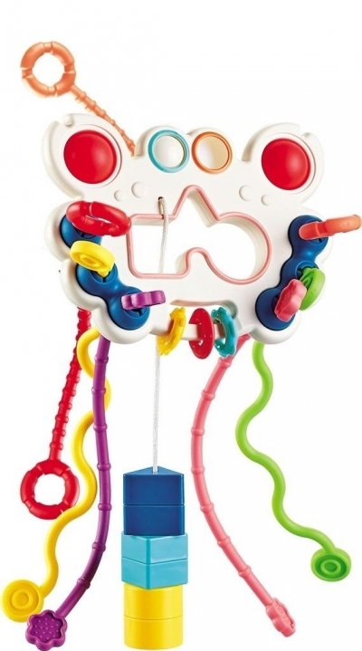 Zabawka łączy w sobie wiele zręcznościowych zadań, zapewniających maluchowi prawdziwą gimnastykę paluszków! Są tu linki do przeciągania, różniące się kolorem, kształtem i wypustkami, obrotowe krążki, kuleczki pop it do wciskania, a nawet sorter kształtów z trzema klockami, doczepionymi do zabawki za pomocą sznureczka. Zabawka pozwala najmłodszym odkrywać zależności przyczynowo skutkowe i rozwijać zdolności poznawcze.