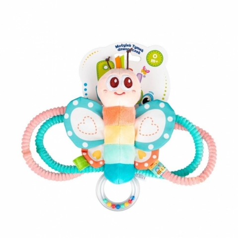 Tymek, szeleszcząc wesoło, zaprasza do sensorycznej zabawy! Kolorowy motylek wyposażony został w kryty dzwoneczek, który wydaje uroczy dźwięk przy każdym potrząśnięciu zabawką. Kolorowe, fakturowane obręcze, które zdobią Tymka są elastyczne i dostosowane do małych rączek, co ułatwia najmłodszym chwytanie zabawki. Jakby tego było mało, Motylek posiada także grzechoczący element, a jest nim przezroczysty krążek, wypełniony koralikami. Zabawka uszyta została z materiałów o zróżnicowanych fakturach, co pozwala rozwijać zdolności poznawcze malucha, zachęcając go do odkrywania świata za pomocą zmysłów.
