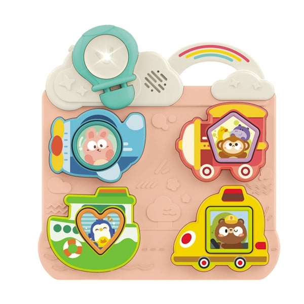 Sorter zawiera 9 kolorowych elementów w formie pojazdów i figur, które należy dopasować do odpowiednich otworów. Po prawidłowym umieszczeniu kształtu zabawka nagradza dziecko dźwiękami imitującymi pojazdy oraz wesołymi melodyjkami, co dodatkowo zachęca do dalszej zabawy.