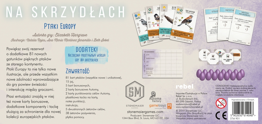 W pierwszym dodatku do gry Na skrzydłach macie okazję powiększyć swój rezerwat o gatunki pięknych ptaków Europy. Ptaki te dysponują nowymi zdolnościami, które działają na koniec rundy, zwiększają interakcję między graczami, umożliwiają zakrywanie kilku pól na planszy czy przynoszą korzyści, gdy ktoś ma nadmiar kart lub pożywienia. Karty z dodatku Ptaki Europy należy wtasować do talii kart z gry podstawowej.