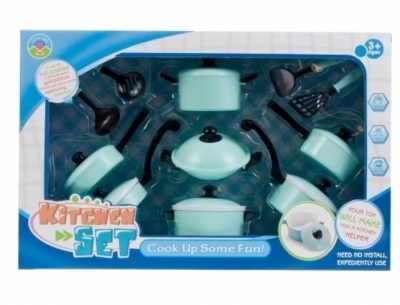 Bogaty zestaw naczyń kuchennych pozwoli dziecku na wspaniałą zabawę w kucharza.