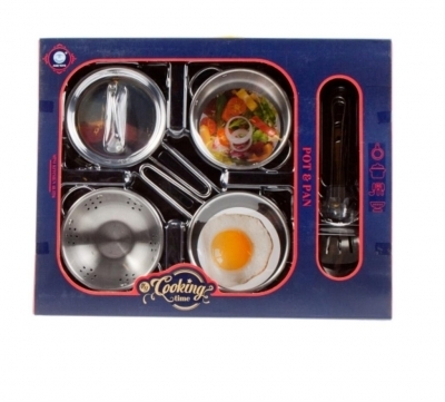 Wieloelementowy zestaw metalowych naczyń kuchennych.