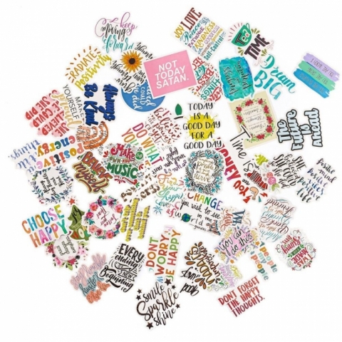 Winylowe naklejki z motywacyjnymi sloganami , 5-8 cm, w zestawie 50 różnych motywów utrzymanych w jasnych i nowoczesnych kolorach.