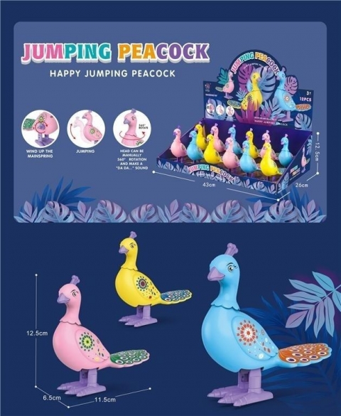 Odkryj uroki nakręcanych pawi - zabawek, które rozweselą każde dziecko! Te urocze, kolorowe ptaszki o wysokości 12,5 cm są gotowe do skakania i obracania głową o pełne 360 stopni, a każdemu ruchowi towarzyszy zabawny dźwięk "Da Da". Wystarczy nakręcić sprężynę, aby uruchomić mechanizm. Pawiowe skrzydła i ogony zdobią delikatne wzory, dodając im jeszcze więcej uroku. Sprzedawane w wygodnym opakowaniu zbiorczym zawierającym 12 sztuk, są doskonałym wyborem na prezenty, upominki na przyjęcia czy do wypełnienia skrzyni z zabawkami. Przeznaczone dla dzieci w wieku 3 lata i starszych. Podana cena dotyczy jednej sztuki nakręcanego pawIa.