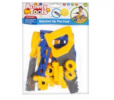 Wieloelementowy zestaw plastikowych narzędzi budowlanych.
