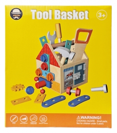 Zestaw drewnianych narzędzi umieszczonych w skrzynce w kształcie domku. W komplecie znajdują się m.in. młotek, klucz, śrubokręt, śruby oraz elementy do skręcania. Zabawka umożliwia odgrywanie scenek i ćwiczenie podstawowych czynności manualnych. Produkt przeznaczony dla dzieci od 3 lat. Produkt zapakowany w kartonowe opakowanie. Podane wymiary są wymiarami opakowania.