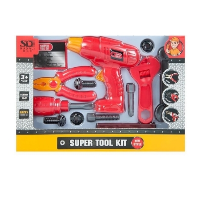 W zestawie znajdują się: wiertarka z wymiennimy końcókami ( wiertło, śrubokręt płaski, śrubokręt krzyżakowy), kombinerki, deseczka, identyfikator, śrubokręt, 2x śruby z nakrętkami, klucz płasko oczkowy, klucz nastawny. Wiertarka posiada efekt kręcącego się wiertła - uruchamiany ręcznie, za pomocą przyciskania włącznika.