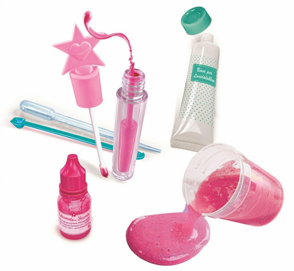 Zestaw kosmetyczny do wyrobu kosmetyków do pielęgnacji ust: kolorowy i pachnący balsam do ust oraz błyszczyk do ust.