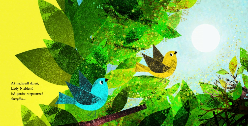 „Niebieski i Żółty” to inspirująca książka o sile przyjaźni. Niebieski mieszka samotnie w najciemniejszej części lasu. Siedzi na najniższej gałęzi, gdzie nie docierają promienie słońca. Jest smutny i już zapomniał, jak to jest śpiewać, latać i cieszyć się życiem. Nie bawi się z innymi. Ale pewnego dnia w lesie pojawia się drugi ptaszek, Żółty. Bije od niego ciepło i promienność. Cierpliwie, łagodnie i wytrwale próbuje dotrzeć do Niebieskiego, oswoić go, przezwyciężyć jego lęk i skłonić, by razem z nim zaśpiewał. A potem poszybował ku niebu. A wtedy wszystko się zmieni i nabierze radosnych, słonecznych barw.