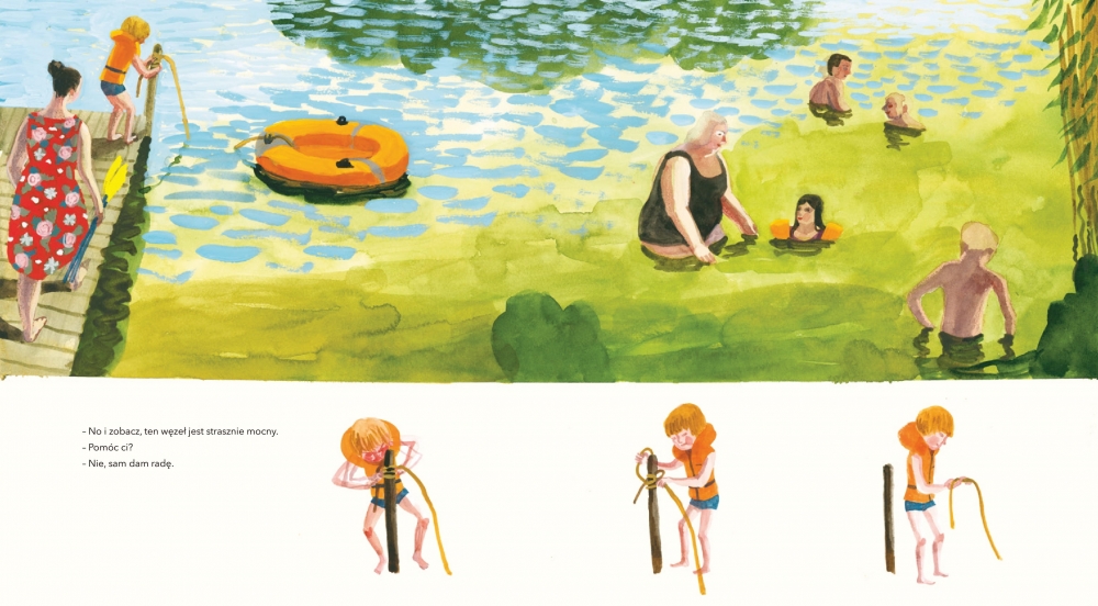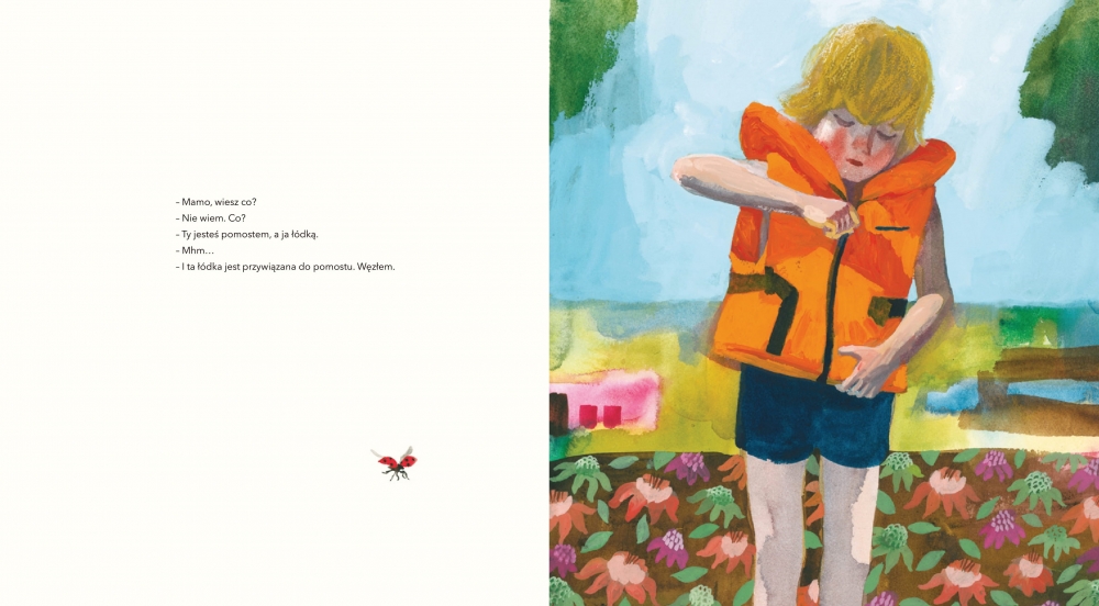 Sara Lundberg: Życie jest przygodą. Nigdy nie wiadomo, co się może wydarzyć – trzeba po prostu płynąć z prądem. Tak jak chłopiec, bohater tej opowieści. Rozwiązuje węzeł i rusza w dół rzeki, podczas gdy mama zostaje na brzegu. Chłopiec wraca z nasionkiem. Czasem trzeba się udać w nieznane, żeby urosnąć.