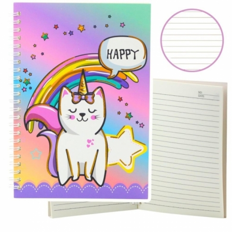 NOTATNIK / ZESZYT KOLOROWY Z KOTEM I TĘCZĄ W LINIE 60 KARTEK A5 Pełen radości i kolorów notatnik z uroczym motywem kota-jednorożca na tle tęczy to doskonały towarzysz codziennych zapisków, notatek i dziecięcych sekretów. Intensywne pastelowe barwy i zabawna ilustracja zachęcają do twórczości, sprawiając, że każde otwarcie zeszytu wywołuje uśmiech. To idealny wybór dla dzieci, które kochają bajkowe postacie, kolorowy świat i chcą wyrażać siebie poprzez pisanie, rysowanie lub planowanie. Zeszyt zawiera 60 kartek w linie, które doskonale sprawdzą się do notatek szkolnych, prowadzenia pamiętnika, czy kreatywnego rysowania. Okładka jest lekka, ale trwała, a spiralne bindowanie ułatwia otwieranie na płasko i wygodne pisanie na każdej stronie. Produkt łączy bajkowy wygląd z funkcjonalnością - będzie świetnym prezentem lub osobistym zeszytem do codziennego użytku. SPECYFIKACJA: Wzór okładki: Kot jednorożec z tęczą Rodzaj okładki: Kolorowa, papierowa, miękka Elementy dekoracyjne: Ilustracja kota, gwiazdek, tęczy i chmurki Rodzaj kartek: W linie Ilość kartek: 60 Kolor kartek: Biały z nagłówkiem Format: A5 Wymiary: 21 x 15 x 1 cm ZAWARTOŚĆ ZESTAWU: Notatnik / zeszyt - 60 kartek w linie