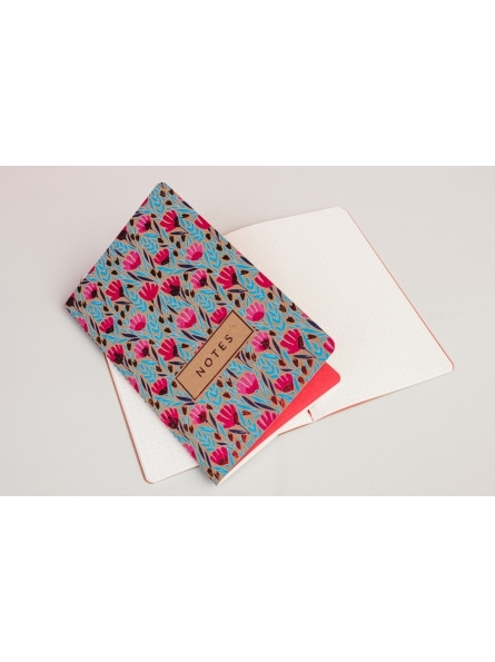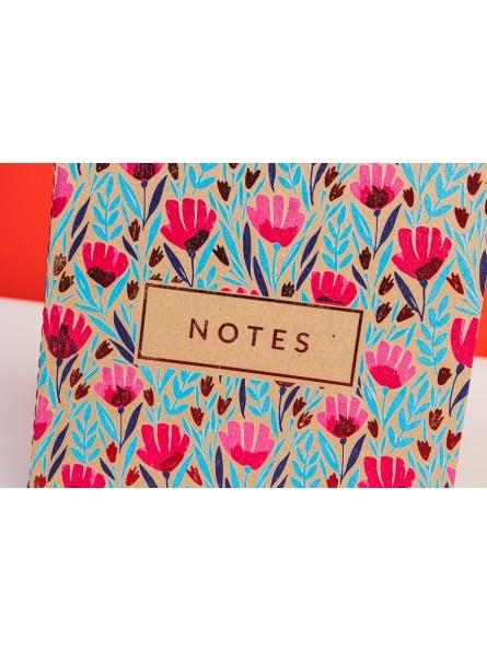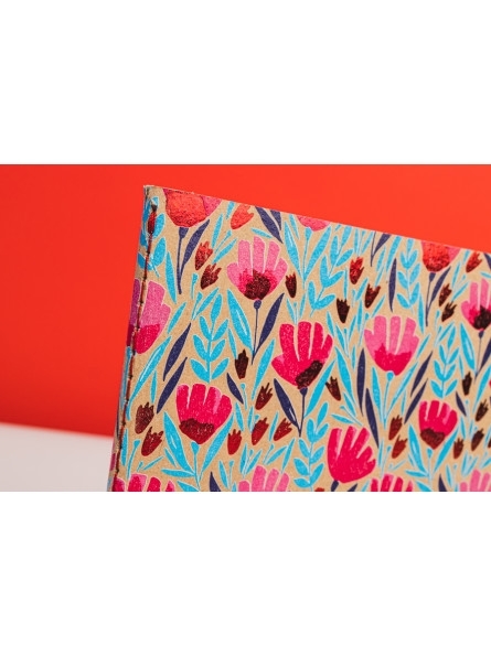 - Okładki notesu z motywami kwiatowymi oraz subtelnie tłoczone elementy grafiki i napisy, tworzą piękne zestawienie z naturalną tekturą. Kolor nici, pierwszej i ostatniej strony notesu uzupełniają stylowy wygląd notesu.