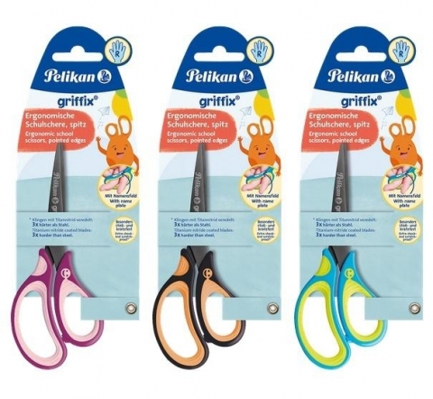 Nożyczki Pelikan Griffix ze szpiczastymi końcówkami to propozycja dla dzieci, które są gotowe na nieco większą precyzję i dokładniejsze prace plastyczne. Dzięki ostrzu pokrytemu tytanową powłoką, które jest trzykrotnie twardsze od stali, nożyczki zapewniają trwałość i perfekcyjne cięcie. Ergonomiczny uchwyt z miękkim wykończeniem gwarantuje komfort użytkowania i pomaga utrzymać prawidłową pozycję dłoni potwierdzaną przez uśmiechniętą buźkę widoczną na obudowie. To wizualne wsparcie sprawia, że dziecko samo wie, czy trzyma narzędzie poprawnie. Długość 15 cm oraz lekka konstrukcja sprawiają, że nożyczki idealnie sprawdzają się w codziennych szkolnych zadaniach, a specjalne miejsce na podpis pomaga je łatwo zidentyfikować w klasie czy piórniku.