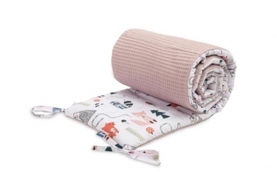 Cienki ochraniacz do łóżeczka od Sensillo to alternatywa dla grubych i ciężkich ochraniaczy powszechnie stosowanych w dziecięcych łóżeczkach. Cienkie wypełnienie z antyalergicznej owaty zapewnia odpowiednią izolację, ochroni dziecko przed urazami podczas poruszania się po łóżeczku, a przede wszystkim jest bezpieczne i minimalizuje ryzyko uduszenia się maluszka. Na niepowtarzalny wygląd ochraniacza składa się połączenie dwóch materiałów. Jedna strona wykonana została z miękkiej i przyjemnej w dotyku bawełny o strukturze wafla oraz druga z bawełny z kolorowym nadrukiem. Wszyte co ok. 30 cm tasiemki do mocowania gwarantują utrzymanie ochraniacza we właściwej pozycji.