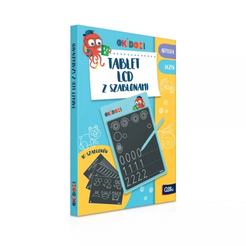 Zawartość: tablet LCD o przekątnej 8,5 cala, rysik, wymienna bateria (zainstalowana), 5 dwustronnych szablonów (cyfry, litery, gry, zwierzęta), instrukcja