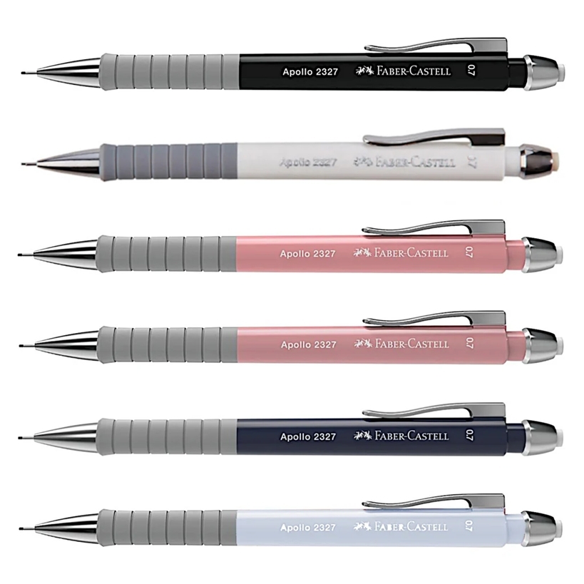Ołówek automatyczny Apollo Faber-Castell 1 szt. z wkładami w opakowaniu blistrowym. Nowoczesny ołówek do pisania i szkicowania. Wysoce ergonomiczny, dzięki antypoślizgowej, gumowej strefie uchwytu. Wyposażony w technologię amortyzującą grafit dla ochrony przed łamaniem. Chowana osłona grafitu. Ze zintegrowaną gumką i metalowym klipsem. Średnica grafitu: 0,7 mm.
