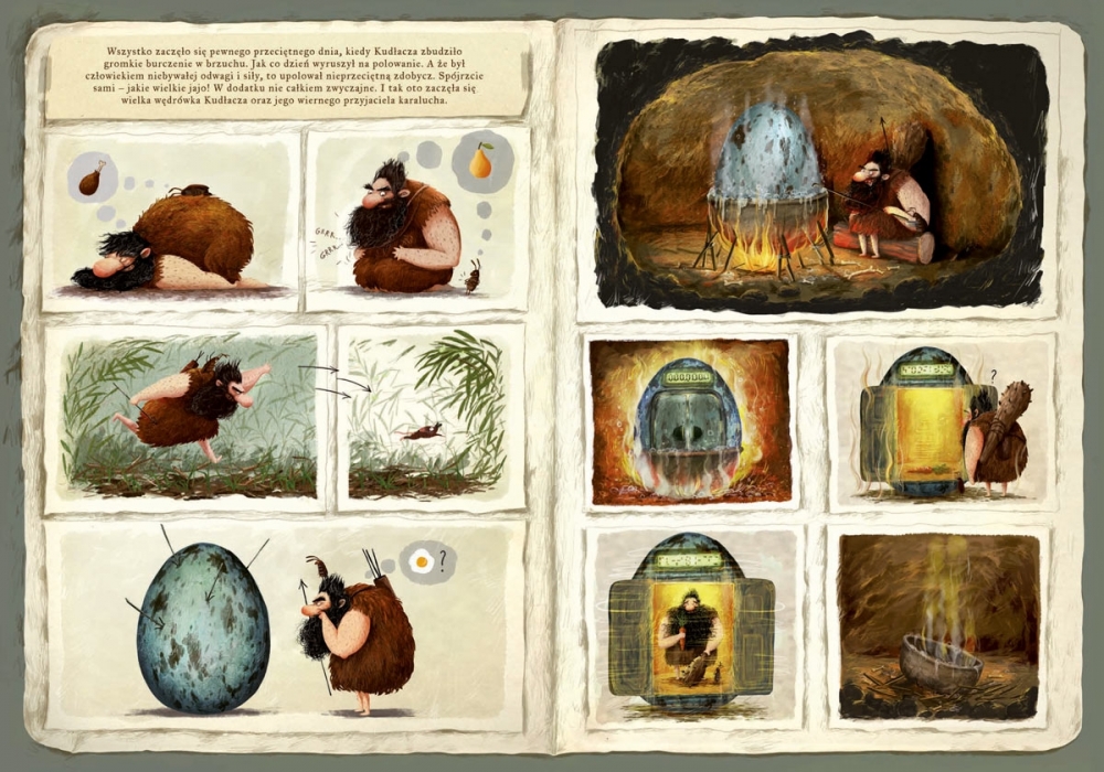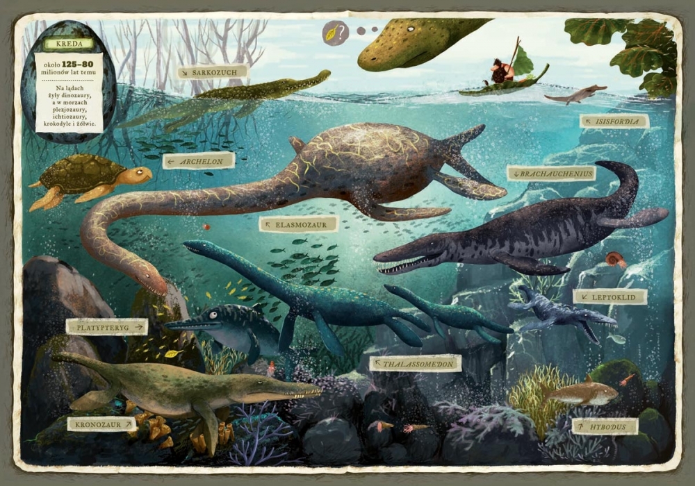 Kudłacz i karaluch wyruszają w podróż... w czasie. Trafią do krainy dinozaurów i poznają te niezwykłe zwierzęta: olbrzymiego Riochazaura, Trematozaura, który zgubił jajo, roślinożernego Diplodoka, żyjącego w wodzie Plejozaura, Tyranozaura Rexa kłócącego się z Ankylozaurem, latające Archaeopteryxy i wiele, wiele innych. Edukacja, humor, zadania interaktywne, a przede wszystkim piękne ilustracje Emilii Dziubak sprawiają, że nie sposób przejść obok tej książki obojętnie. To znakomity prezent dla dzieci w wieku od 2 do 6 lat.