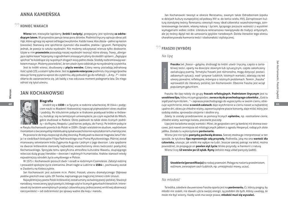 Książka dla klas 4-6 zawiera omówienia wszystkich znajdujących się w podstawie lektur, zarówno obowiązkowych, jak i uzupełniających, oraz interpretacje i analizy najczęściej omawianych wierszy wymienionych poetów. Są tutaj biografie, streszczenia, charakterystyki bohaterów, problematyka - wszystkie najważniejsze informacje o lekturze w jednym miejscu.