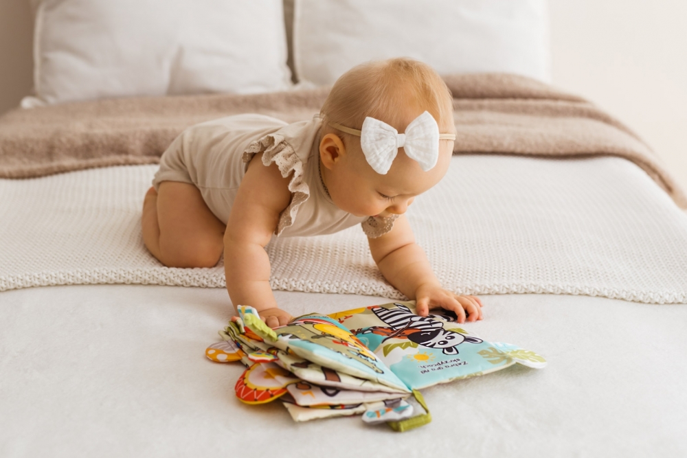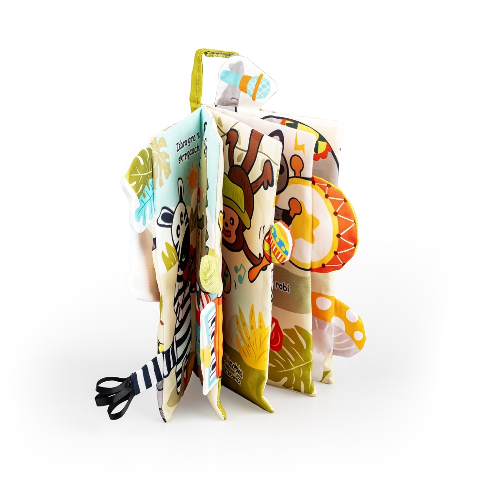 Muzykalne zwierzaki pochowały się na kartach materiałowej książeczki, aby zapewnić najmłodszym wesołą rozrywkę! Na szeleszczącej okładce znajduje się obrotowa papuga, którą można odpiąć, a wewnątrz książeczki, kolorowe obrazki zwierzakowej orkiestry. Z poszczególnych stron wystają materiałowe elementy o zróżnicowanych fakturach, a przy obrazkach zwierzaków znajdziemy krótkie zdania w języku polskim. Książeczka wyposażona jest w praktyczną zawieszkę, dzięki której można ją przyczepić w dowolnym miejscu.
