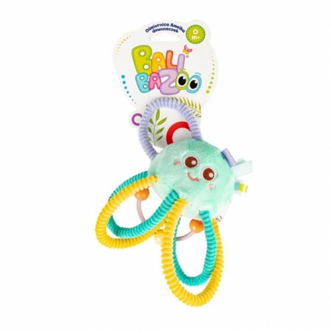 Milutka ośmiorniczka to pluszak, który zajmie rączki malucha sensoryczną zabawą! Amelka kryje w sobie dzwoneczek, wydający wesoły dźwięk, przy każdym potrząśnięciu zabawką. Ośmiornicę zdobią cztery kolorowe, fakturowane obręcze, które są elastyczne i dopasowane do rączek malucha, co ułatwia najmłodszym chwytanie zabawki. Amelka uszyta została z materiałów o zróżnicowanych fakturach, dzięki czemu pozwala najmłodszym rozwijać zdolności poznawcze, zachęcając ich tym samym do odkrywania świata za pomocą zmysłów.