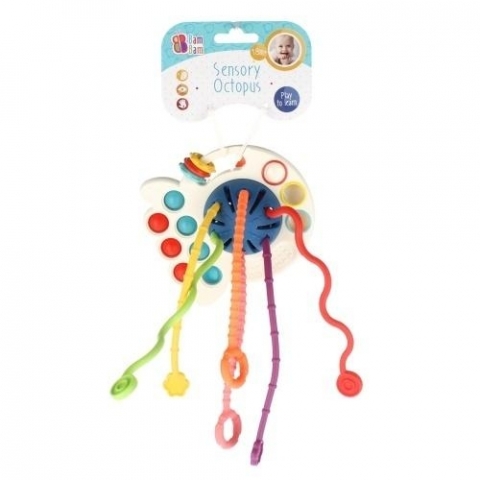 Unikalna Zabawka sensoryczna Ośmiornica 4w1 BAM BAM to zabawka, która przynosząc wiele doznań sensorycznych doskonale wpływa na rozwój dziecka na wielu płaszczyznach. Osadzone na Ośmiornicy miękkie, silikonowe ramiona w ilości 6 sztuk, w bajecznych kolorach, po przeciągnięciu z jednej na drugą stronę angażują malucha na długo, dając mu masę powodów do śmiechu, rozwijając przy tym jego zdolności manualne oraz motorykę małą. Wypukle bąbelki można przepychać w nieskończoność z jednaj na drugą stronę aż do znudzenia, plastikową piłeczkę można przepychać w trzy kolorowe dziurki ćwicząc sprawność i spryt, a kolorowe grzechotki dodatkowo zaciekawią maluszka. Wymiary/waga/baterie: wymiary produktu (dł. x wys. x gł.)[cm]: 12x25x14, wymiary opakowania (dł. x wys. x gł.)[cm]: 12x25x14 waga produktu bez opakowania [kg]: 0,13 kg, waga produktu w opakowaniu [kg]: 0,14 kg, nie wymaga zasilania bateriami. Zabawka przeznaczona dla dzieci w wieku: 18m+. Pakowana na blistrze.
