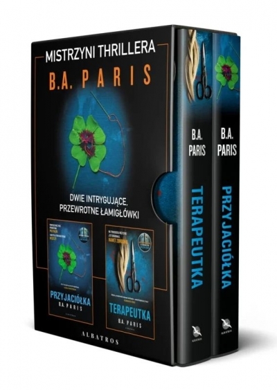 Dwa bestsellery jednej z najpopularniejszych autorek thrillerów w Polsce. TERAPEUTKA Powieść nagrodzona statuetką Bestsellera Empiku za 2021 rok w kategorii literatura popularna. Budząca dreszcz grozy opowieść o wymarzonym domu, który skrywa mroczną tajemnicę… Alice i Leo wprowadzają się do świeżo wyremontowanego domu na zamkniętym osiedlu. Właśnie spełnia się ich marzenie. Ale pozory mogą mylić. PRZYJACIÓŁKA Najnowsza powieść B.A. Paris, która uwiodła miłośników thrillerów psychologicznych na całym świecie powieścią „Za zamkniętymi drzwiami”. Iris i Gabriel mają wszystko, czego można zapragnąć, dopóki w ich domu nie zjawia się nieproszony gość, a ich życie nie zaczyna się niespodziewanie komplikować… Czy ktokolwiek wie, co w tym wszystkim chodzi? B.A. Paris rozwiązuje zagadkę w niesamowitym finale!