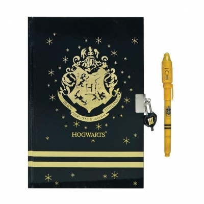 Pamiętnik Zamykany na Kłódkę z Sekretnym Pisakiem, Harry Potter Zamykany na kłódkę pamiętnik Harry'ego Pottera w twardej oprawie z efektem hologramu i długopisem UV. do zapisywania sekretnych informacji. Prześliczny pamiętnik, notes zamykany na kłódkę z logiem Hogwartu. Okładka w twardej oprawie i dwa klucze. Okładki z grubszego kartonu, powleczonego satynowanym papierem. Dodatkowo dodany długopis UV, sekretny pisak (zawiera baterie ) z lampką LED posiada tusz widoczny tylko w świetle wbudowanej latarki UV tym samym jest niewidoczny dla niepożądanych czytelników. Papier wewnątrz - w linie. Na okładkach grafiki z Hogwartu. Elegancki, wygląda jak książka. Wymiary opakowania: 27,5 cm x 20,5 cm x 4 cm.
