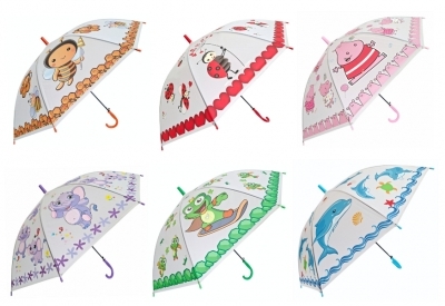 Parasole z różnymi kolorowymi wzorami: pszczółka, biedronka, postać bajkowa, słonik, żabka oraz delfin. Parasole posiadają zakrzywioną rączkę oraz metalowy stelaż.