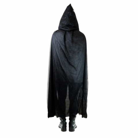 Stylowa peleryna z kapturem to efektowny dodatek do halloweenowych przebrań i wieczornych stylizacji. Uszyta z dwóch warstw materiału - kryjącej bazowej oraz prześwitującej zewnętrznej, na której znajdują się subtelne drobinki brokatu, które delikatnie połyskują przy ruchu i świetle.