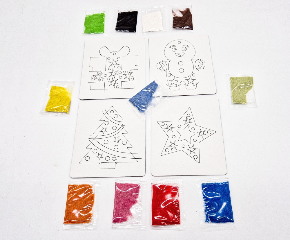 „Piaskowe Malowanki – Ozdoby na Choinkę” to zestaw, który zamienia dziecięcą wyobraźnię w prawdziwe, kolorowe dekoracje. W środku znajdziesz cztery wzory: gwiazdkę, choinkę, prezent i uroczego ciastka oraz 11 woreczków z kolorowym piaskiem. Wystarczy odkleić fragment samoprzylepnego obrazka i posypać go piaskiem, by stworzyć małe dzieło sztuki.