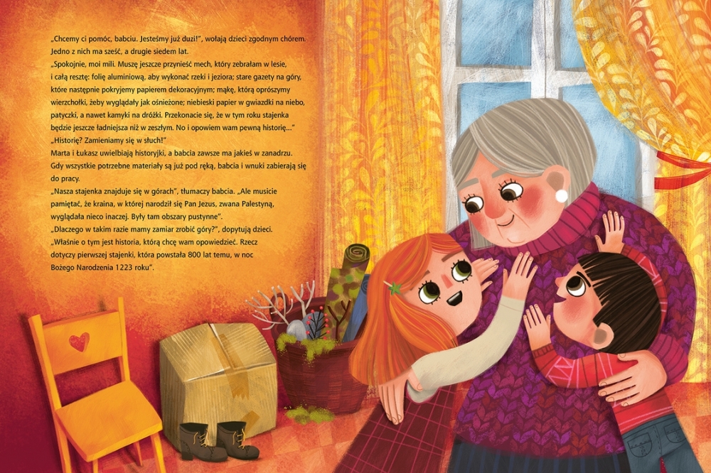 Jest 8 grudnia. Sympatyczne rodzeństwo, Marta i Łukasz, jak wiele innych dzieci w tym czasie, ma przed sobą nie lada wyzwanie: będzie przygotowywać bożonarodzeniową szopkę. W tym twórczym zadaniu wspierać je będzie babcia Ala. To właśnie ona przechowuje figurki, grotę i wszystkie inne dekoracje potrzebne do wykonania stajenki. Zanim jednak prace ruszą pełną parą, starsza pani postanawia opowiedzieć wnukom niezwykłą historię pierwszej szopki, którą w 1223 roku stworzył Święty Franciszek z Asyżu.