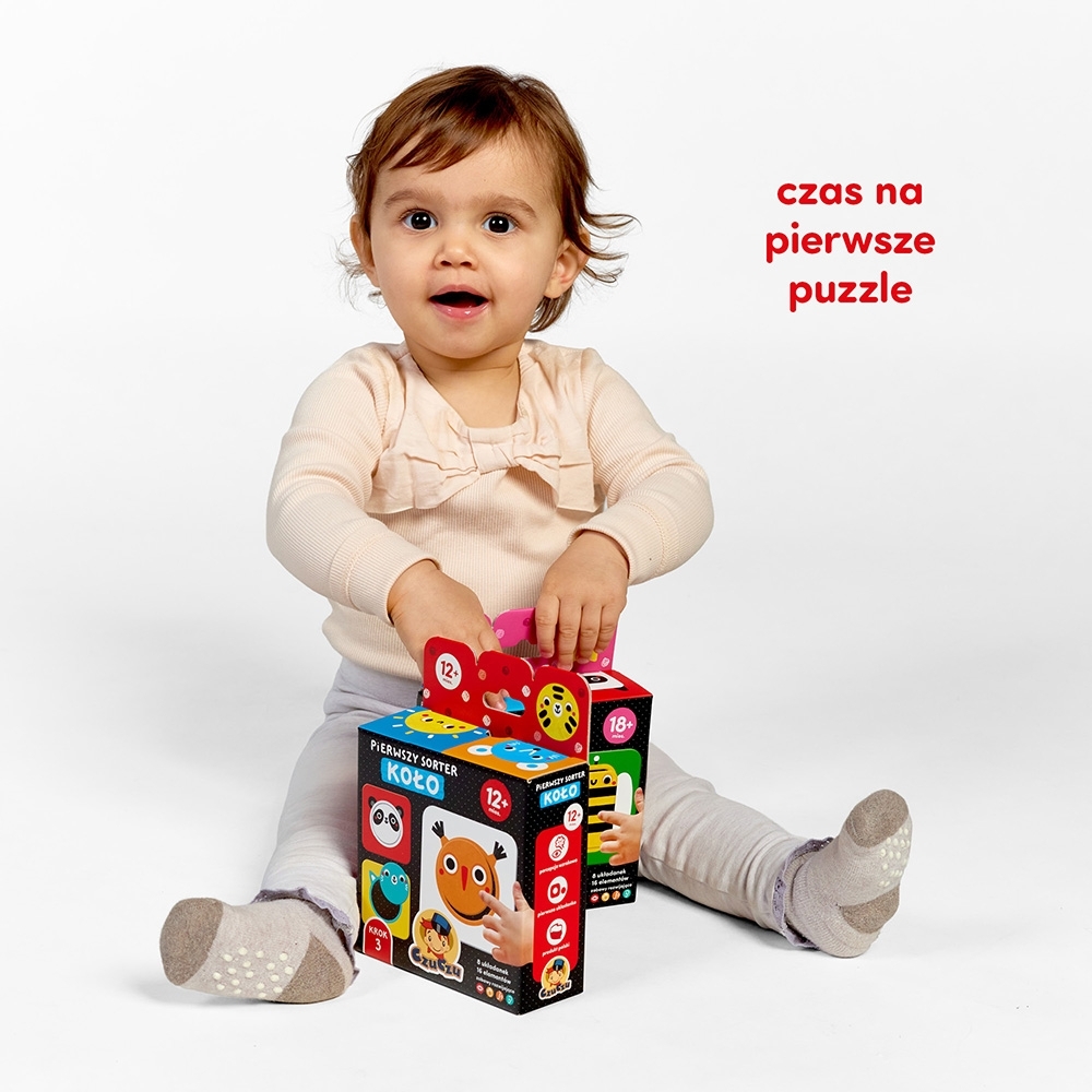 Pierwszy sorter KOŁO od CzuCzu to fantastyczny pomysł na pierwsze puzzle. Precyzyjne układanie to wyzwanie, ale i świetna zabawa, która doskonali sprawność dłoni, spostrzegawczość i logiczne myślenie. Zacznijcie zabawę od prób z 2 lub 3 układankami, stopniowo dokładając kolejne. Pokaż maluchowi, jak dokładać kółeczka. Początkowo możesz to nawet robić jego rączkami. Pokazuj i opisuj to, co widać na ilustracjach. To świetna okazja, by poznawać nowe słowa.