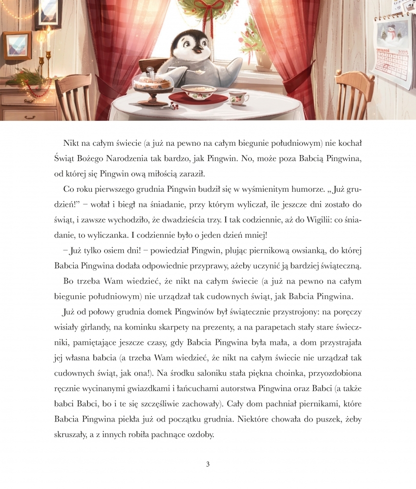 Bardzo się martwi, że Mikołaja dopadło Straszliwe Przeziębienie. Bo ZAWSZE odpisywał. A co jeśli teraz Święta są zagrożone? I dzieci nie dostaną prezentów? Pingwin wyrusza z misją ratunkową: nadaje siebie samego w przesyłce lotniczej na biegun północny – musi szybko dostarczyć Mikołajowi babciny syrop malinowy z lipą. Jemu zawsze pomagał! Czy uda mu się dotrzeć do celu i uratować Święta?