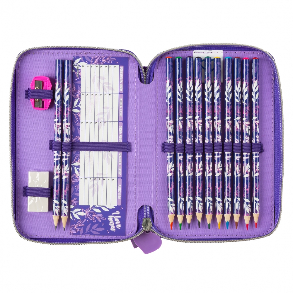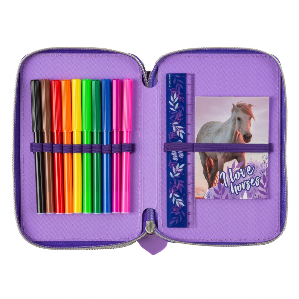 - Piórnik podwójny z wyposażeniem. Posiada dwie komory zamykane na zamek, suwaki mają ozdobne zakończenia.