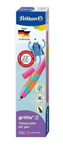 Pióro kulkowe Pelikan Griffix to etap 3 w 4-stopniowym systemie nauki pisania stworzonym przez markę Pelikan. Po opanowaniu rysowania kredkami i pisania ołówkiem, dziecko jest gotowe na kolejny krok rozpoczęcie nauki pisania piórem. Na tym etapie dzieci nadal doskonalą chwyt szczypcowy, a jednocześnie zaczynają przyzwyczajać się do korzystania z narzędzia piśmienniczego z płynnym atramentem. Ponieważ młodsze dzieci mają tendencję do silniejszego naciskania na papier, pióro zostało wyposażone w specjalną końcówkę, która amortyzuje nacisk i umożliwia miękkie, płynne pisanie bez oporu. Widoczna uśmiechnięta buźka na korpusie podpowiada dziecku, że trzyma pióro prawidłowo. Ergonomiczny, trójkątny uchwyt pokryty został gumowaną powierzchnią, dzięki czemu dłoń się nie ślizga, a dziecko uczy się pisać w sposób wygodny i naturalny. Pióro działa na naboje atramentowe kulkowe, co czyni je czystym i łatwym w obsłudze.