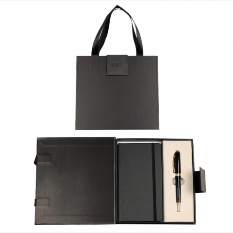 Zestaw prezentowy w ciekawym opakowaniu imitującym torebkę prezentową. Komplet zawiera notes z gumką i wstążką oraz eleganckie grafitowe pióro wieczne SYMPHONY. Zestaw upominkowy spakowany w kartonowe etui z zapięciem magnetycznym. Po zamknięciu opakowanie przybiera postać torebki prezentowej z uchwytami ze wstążki. Zatem po zakupie jest to gotowy prezent do wręczenia na różne okazje.