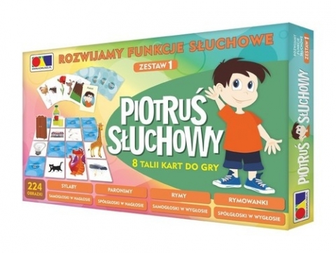 Piotruś słuchowy. Zestaw I Piotruś słuchowy zawiera 8 talii po 29 kart. Jest pomocą wspomagającą rozwój funkcji słuchowych u dzieci w wieku od 3 do 6 lat. Karty można wykorzystać w pracy zarówno z dziećmi prawidłowo rozwijającymi się, jak i z dziećmi, u których stwierdzono zaburzenia słuchu fonemowego. Zawarte w zestawie talie kart umożliwiają ćwiczenie: analizy i syntezy sylabowej słów, umiejętności dobierania/różnicowania paronimów i rymów oraz słuchowego wyodrębniania głosek w nagłosie i wygłosie słów. Dołączona w zestawie instrukcja zawiera 25 przykładowych ćwiczeń z kartami Piotruś słuchowy. Zestaw składa się następujących talii: - sylaby, - paronimy, - rymy, - rymowanki, - samogłoski w nagłosie, - spółgłoski w nagłosie, - samogłoski w wygłosie, - spółgłoski w wygłosie. Wiek graczy: 3+ Liczba graczy: 2-6