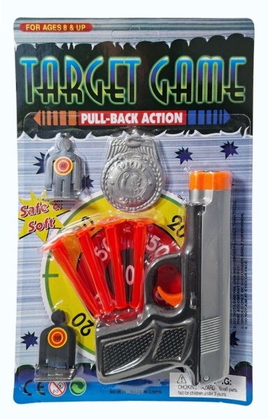 Zestaw do strzelania do celu. W komplecie pistolet oraz tarcza z punktacją, którą można wyciąć z opakowania. Ponadto w zestawie także policyjna odznaka. Zestaw pomaga ćwiczyć celność u dzieci. Produkt dla dzieci od 8 lat. Podane wymiary są wymiarami opakowania. Produkt zapakowany w kartonową podstawkę z przezroczystym kloszem.