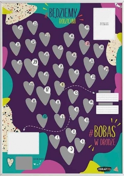 Plakat do zdrapywania pomoże Wam przygotować się do narodzin malucha i spędzić czas oczekiwania na wspólnej, beztroskiej zabawie. Na plakacie, pod polami do zdrapywania, znajdują się ciekawostki i zadania dla przyszłej mamy i przyszłego taty albo miejsca do udokumentowania przebiegu ciąży. Co tydzień można zdrapać kolejne serduszko! Kupcie plakat dla siebie i razem odkrywajcie kolejne jego tajemnice! Kiedy już wszystkie pola będą zdrapane, pozostanie piękna pamiątka, która może wisieć na ścianie.