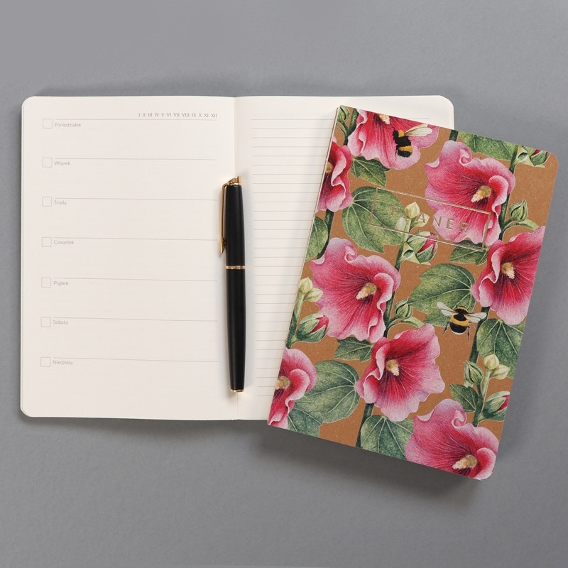 - Unikalne szycia gwarantują lekkość i atrakcyjny wygląd oprawy. Okładka planera z ilustracją w kwiaty malwy i złotym tłoczeniem oraz kolorowy zadruk środka podkreśla gustowną stylizację.
