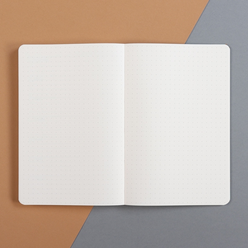 - Wyjątkowa technika szycia sprawia, że planer otwiera się na płasko, a odkryty grzbiet odsłania konstrukcję planera.